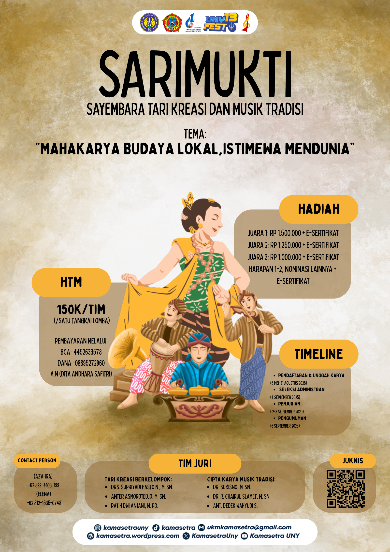 Menyikapi hal tersebut, Unit Kegiatan Mahasiswa Keluarga Mahasiswa Seni Tradisi (KAMASETRA) dibawah naungan Universitas Negeri Yogyakarta mengambil inisiatif dengan mengadakan kompetisi SARIMUKTI (Sayembara Tari Kreasi dan Musik Tradisi) tingkat nasional untuk mahasiswa S1/D4 perguruan tinggi/politeknik/institut non-seni, yang juga merupakan rangkaian dari UNY FEST 13. Dengan tema “Mahakarya Budaya Lokal, Istimewa Mendunia”, diharapkan kompetisi ini menjadi ajang sportif dalam menunjukkan potensi berprestasi melalui seni, mendorong minat & bakat dalam berkarya, dan bersama membawa budaya lokal semakin mendunia.